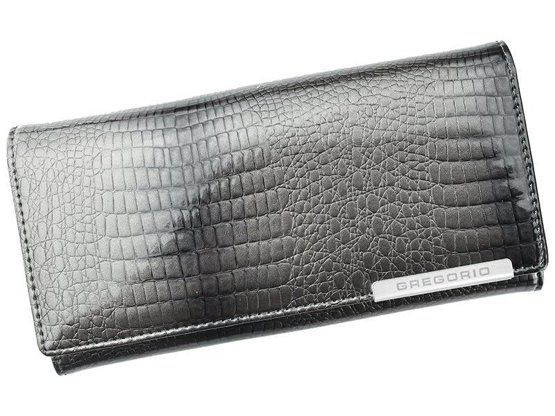 Klasyczny, podłużny, damski portfel w typie portmonetki od marki Gregorio. Wykonany został z najlepszej jakości skóry naturalnej lakierowanej ze srebrnymi zdobieniami i niepowtarzalnym, zwierzęcym wzorem, który przypomina skórę węża.
