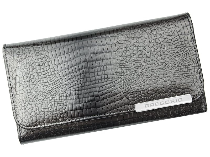 - Duży, klasyczny, podłużny damski portfel od marki Gregorio. Wykonany z wysokogatunkowej skóry naturalnej. Wykończony srebrnymi zdobieniami. Piękna lakierowana faktura ze wzorem skóry krokodyla. Wewnątrz bogato wyposażony.