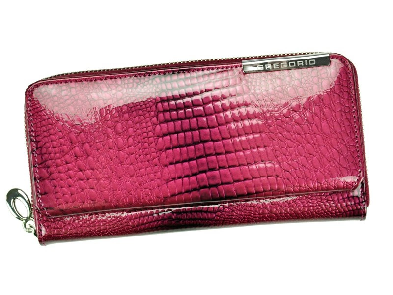• Wyjątkowo pakowany, duży portfel od marki Gregorio. Świetne wykończenie ze skóry lakierowanej z pięknym motywem skóry węża, krokodyla. Srebrne zdobienia podkreślają wyrazistość i dodają temu modelowi eleganckiego i gustownego charakteru.
