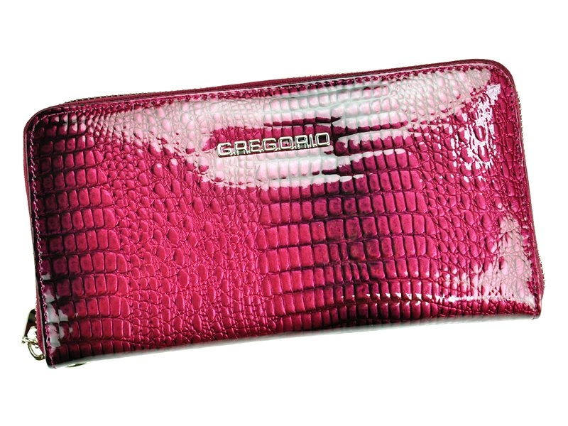 Posiada liczne przegrody na karty kredytowe, miejsce na zdjęcie oraz kieszeń na monety, dzięki czemu w Twoim portfelu już zawsze będzie ład i porządek. Piękna faktura ze wzorem w typie skóra krokodyla, na której umieszczone zostało logo producenta Gregorio w srebrnym okuciu. Portfel został wykonany z dbałością o najmniejszy szczegół, dzięki czemu jest w stanie sprostać nawet najbardziej wymagającym kobietom. Z pewnością przypadnie Ci do gustu! Świetna propozycja dla każdej z Pań. Zapakowany w oryginalne, logowane pudełko - idealne na prezent.