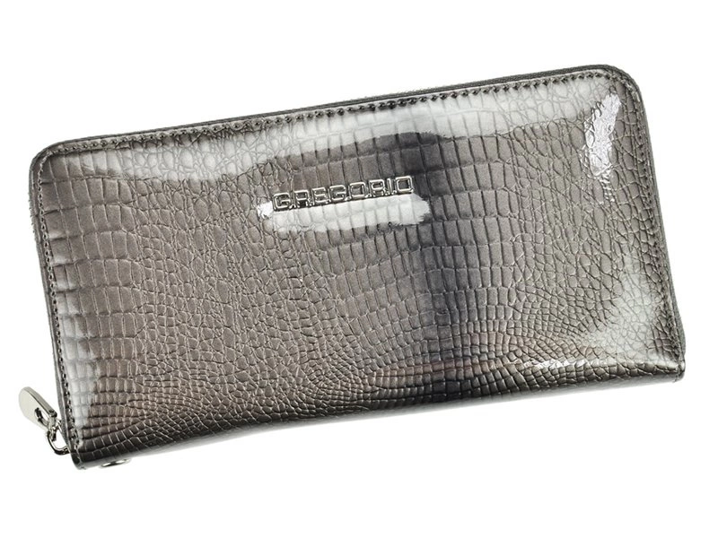 Posiada liczne przegrody na karty kredytowe, miejsce na zdjęcie oraz kieszeń na monety, dzięki czemu w Twoim portfelu już zawsze będzie ład i porządek. Piękna faktura ze wzorem w typie skóra krokodyla, na której umieszczone zostało logo producenta Gregorio w srebrnym okuciu. Portfel został wykonany z dbałością o najmniejszy szczegół, dzięki czemu jest w stanie sprostać nawet najbardziej wymagającym kobietom. Z pewnością przypadnie Ci do gustu! Świetna propozycja dla każdej z Pań. Zapakowany w oryginalne, logowane pudełko - idealne na prezent.