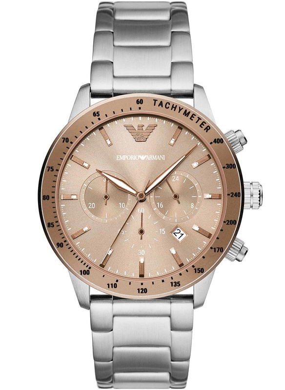 Zegarek Emporio Armani AR11352 Mario to męski czasomierz, idealny zarówno do eleganckiego ubioru, jak i na co dzień. Na beżowej tarczy zabezpieczonej mineralnym szkłem znajdziemy datownik wskazujący dzień miesiąca oraz subtarcze będące wskazaniami chronografu i czasu dobowego oraz stylowe wyznaczniki godzin w odcieniu różowego złota.