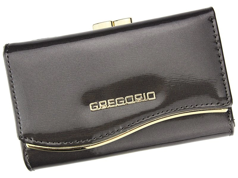 - Śliczna, damska portmonetka, wykonana ze skóry naturalnej lakierowanej, od marki Gregorio. Na klapie widoczne jest logo firmy, złote zdobienie oraz eleganckie obszycie. Wewnątrz 9 przegródek dla kart oraz pojemna kieszeń na monety.