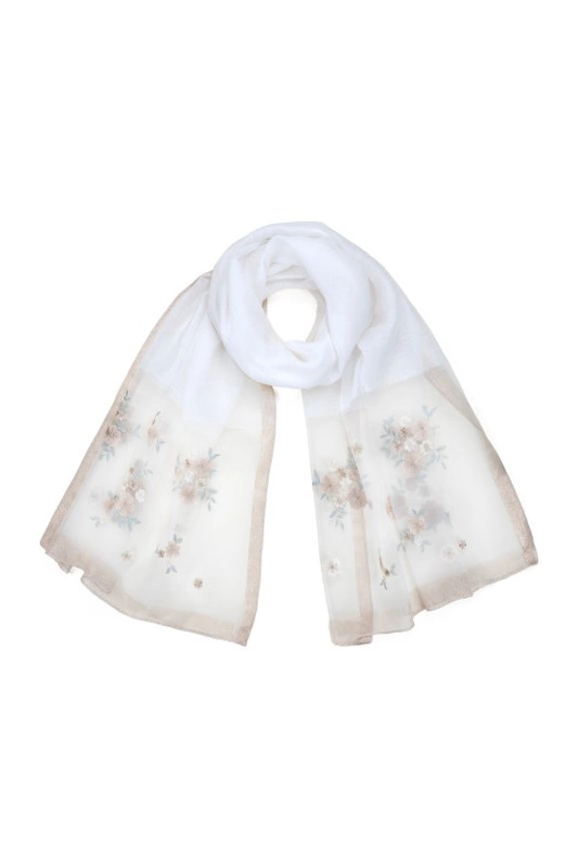 Materiał posiada błyszczące wykończenie i ozdobne, haftowane kwiatki.