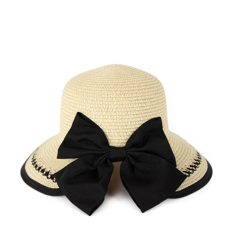 Kapelusz o dużym rondzie, zdobiony czarną, klasyczną tasiemką z kokardką.