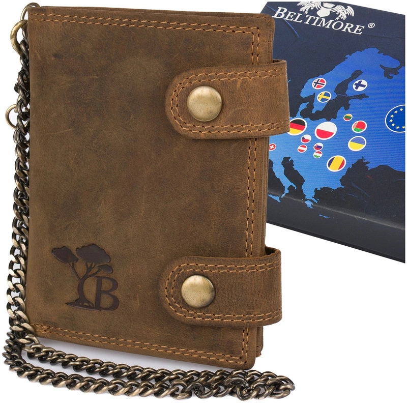 Stylowy, lekki, solidny, skórzany, męski portfel w stylu vintage z łańcuchem, mieszczący dowód rejestracyjny pojazdu, polskiej marki Beltimore®