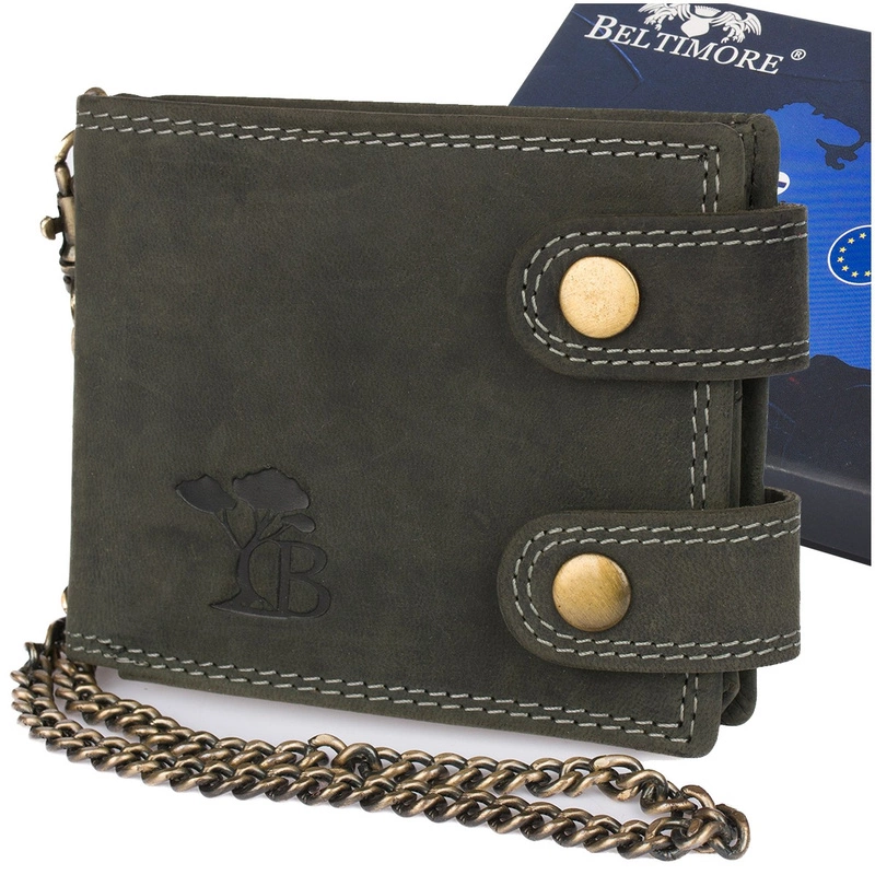 Stylowy, lekki, solidny, skórzany, męski portfel w stylu vintage z łańcuchem, mieszczący dowód rejestracyjny pojazdu, polskiej marki Beltimore w wersji poziomej ®