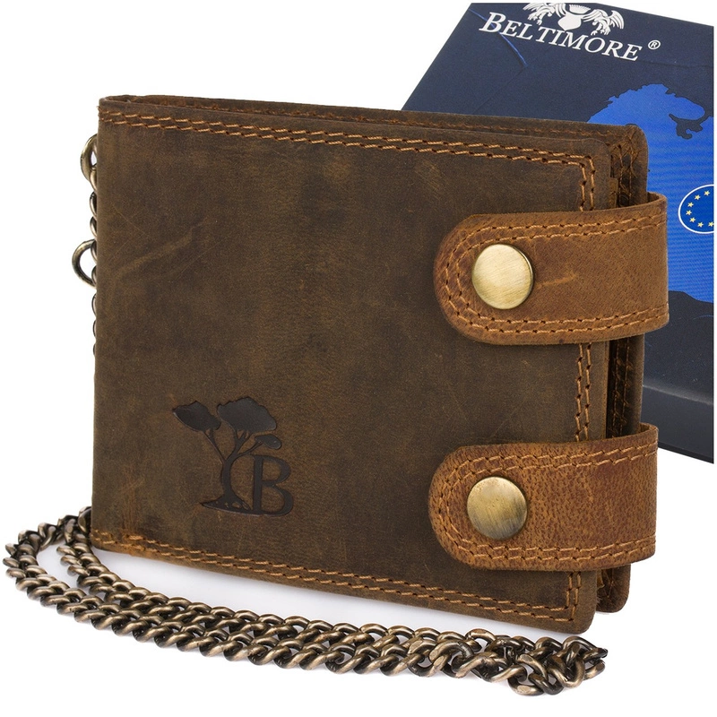 Stylowy, lekki, solidny, skórzany, męski portfel w stylu vintage z łańcuchem, mieszczący dowód rejestracyjny pojazdu, polskiej marki Beltimore w wersji poziomej ®