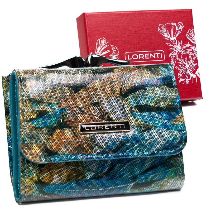 - Portmonetka damska zamykana klapką z zatrzaskiem. Wykonana ze skóry naturalnej pokrytej opalizującym wzorem motyli. Wewnątrz zakładka na kartę i kieszonka na banknoty. Sekcja na bilon zewnętrzna, zamykana biglem. Portfel z systemem RFID Protect.