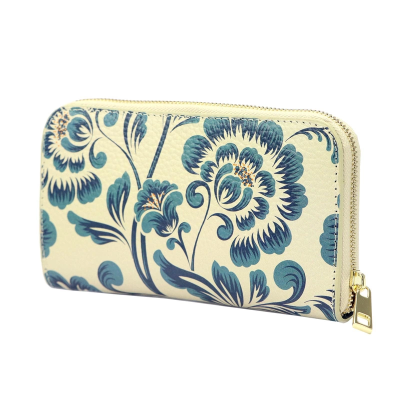 Portfel charakteryzuje się oryginalnym, roślinnym wzorem w kwiaty, który dodaje mu unikalnego stylu. Wzór ten jest subtelnie wpisany w teksturę skóry, tworząc elegancką i kobiecą estetykę. Srebrne okucia dodają portfelowi nowoczesnego blasku, idealnie komponując się z klasycznym podłużnym fasonem.