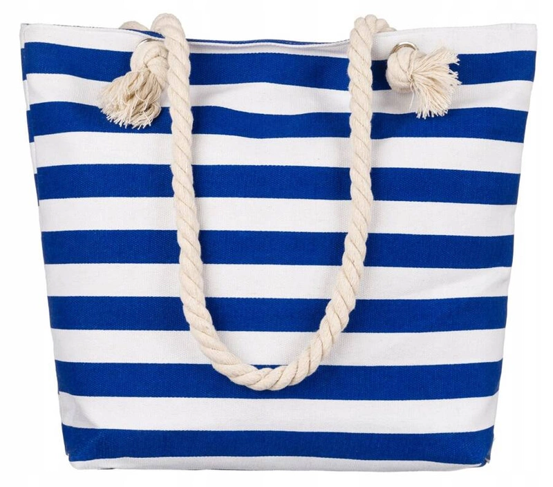 - Zabierz ją na plażę! | Torebka zamykana od góry solidnym zamkiem błyskawicznym. Odszyta z wysokogatunkowego materiału, na którym widnieje motyw w marynarskie pasy;