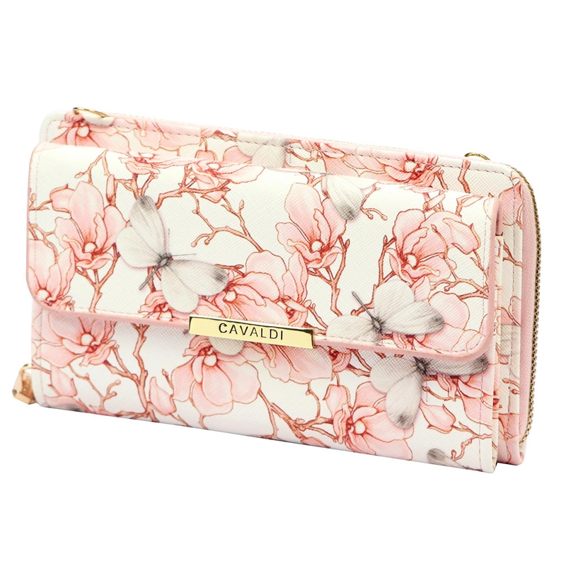• Torebka-portfel damska z kieszeniami od marki Cavaldi. Ozdobiona modnym, kwiatowym printem, zamykana zatrzaskiem i suwakiem. Wnętrze podzielone na praktyczne sekcje na karty i gotówkę. Torebka z komfortowym paskiem na ramię.