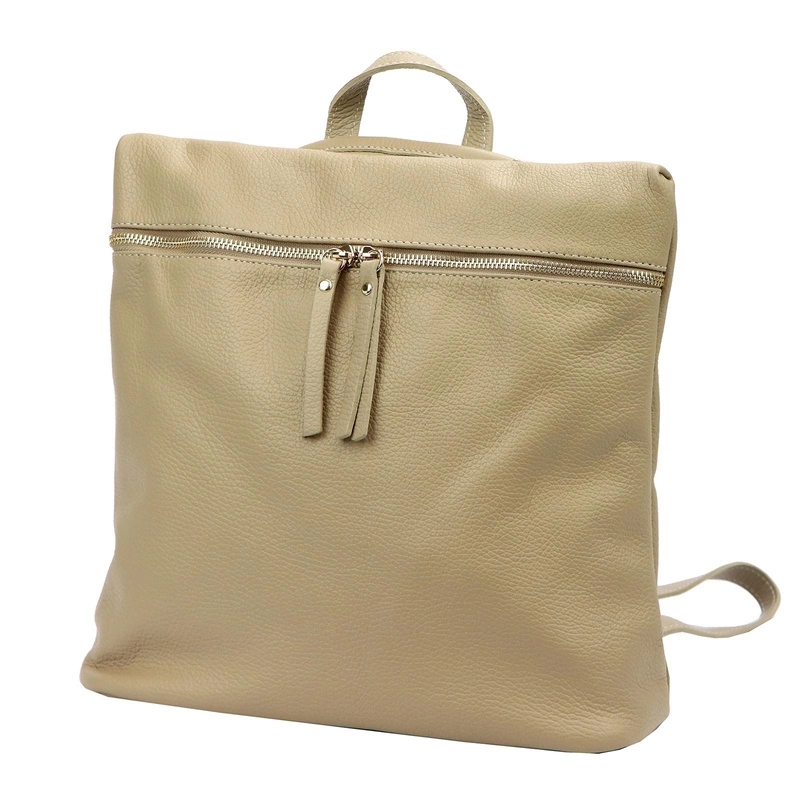 Złote okucia doskonale komponują się z naturalnym odcieniem skóry, dodając elegancji całej kompozycji. Torebko-plecak zapinany jest na solidny suwak, co zapewnia szybki dostęp do wnętrza oraz bezpieczeństwo przechowywanych przedmiotów. Dodatkowo, dwie zewnętrzne zasuwane kieszenie umożliwiają przechowywanie drobnych przedmiotów, które muszą być łatwo dostępne. Zasuwana wewnętrzna kieszonka na dokumenty pomaga w organizacji zawartości torebki.