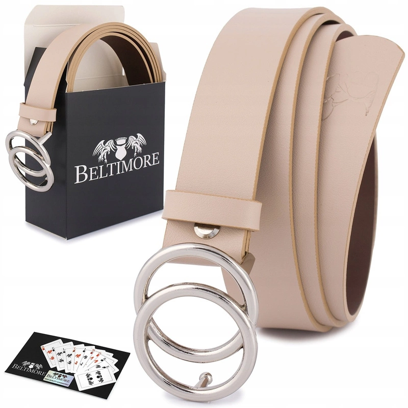 Piękny, skórzany, damski pasek do spodni marki Beltimore®. Jest wytrzymały, solidny i w eleganckim, cielistym kolorze z bardzo wygodną, kobiecą i bardzo modną klamerką w srebrnym kolorze- zamykany na niezawodny bolec.