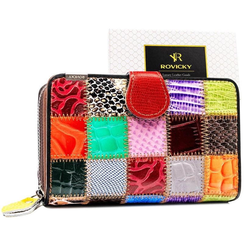 - Portfel został wykonany z wysokogatunkowej skóry naturalnej. Zewnętrzną część portfela zdobi kolorowy patchworkowy wzór. Dzięki dużej ilości przegródek i kieszonek, w tym modelu schowasz wszystkie swoje karty, dokumenty, gotówkę i bilon.