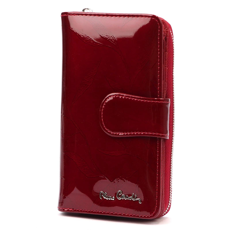 Portmonetka wykonana jest z naturalnej skóry, co zapewnia jej trwałość oraz elegancki, ponadczasowy wygląd. Zewnętrzne lakierowane wykończenie dodaje subtelnego połysku, a motyw roślinny z delikatnymi liśćmi podkreśla oryginalność i wyjątkowy styl. Całość uzupełnia srebrne logo producenta, które podkreśla prestiż marki Pierre Cardin.