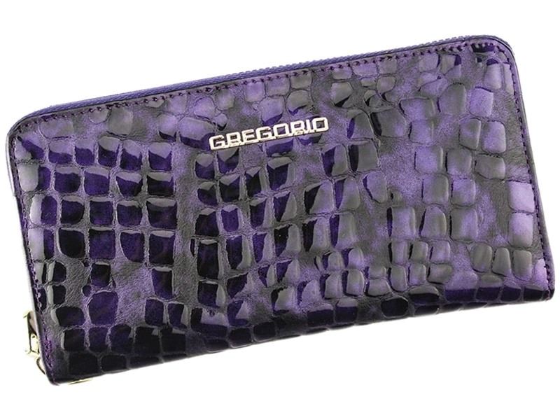 - Szykowny i gustowny, damski duży portfel, od marki Gregorio. Na fakturze widoczny jest wzór w typie skóra węża/krokodyla, eleganckie złote logo producenta, wraz ze starannymi obszyciami oraz krótką skórzaną rączką umocowaną przy suwaku.