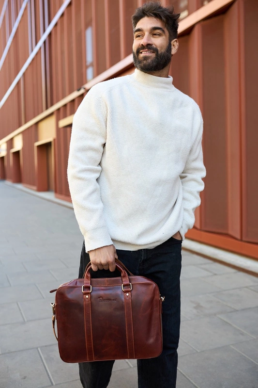- Torba na laptopa wyprodukowana z wysokogatunkowej, trwałej skóry naturalnej garbowanej naturalnie