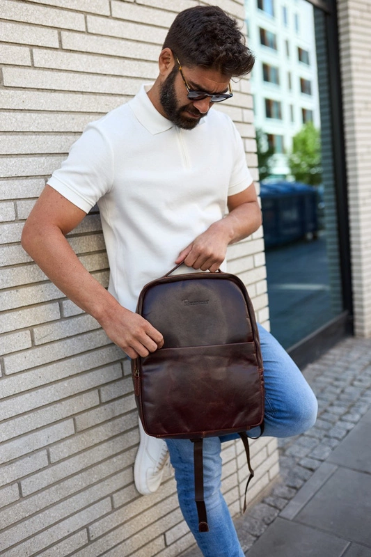 • Plecak skórzany na laptopa ma również skórzany uchwyt do przenoszenia go w ręku