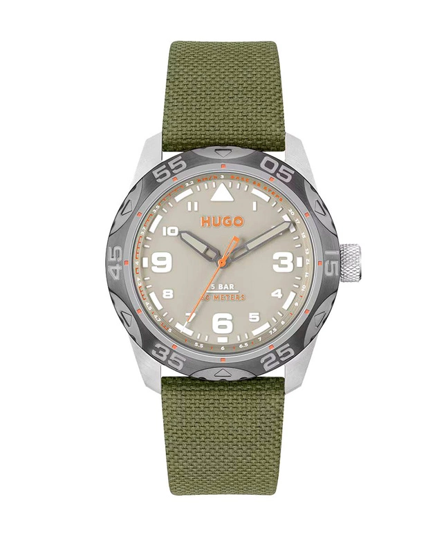 Przedstawiamy oryginalny Zegarek HUGO model 1530331 (42MM). Zegarek wyposażony jest w Kwarcowy mechanizm napędowy. Posiada czytelny Analogowy wyświetlacz. Sercem zegarka jest STAL NIERDZEWNA obudowa wykonana z najwyższą precyzją. Szary kolor zapewnia jej elegancki wygląd. Do koperty zegarka podpięta została mocna FABRIC bransoletka (pasek). Bransoletka ma Zielony kolor i jest zapinana na Klamerka. Zielony wyświetlacz wyposażony został w odporne na zarysowania Mineralne szkiełko. Gwarantuje to komfort użytkowania oraz niezawodność. Średnica tarczy zegarka to 42MM zapewnia to komfortowy odczyt wskazań. Wodoszczelność zegarka to z kolei 5ATM