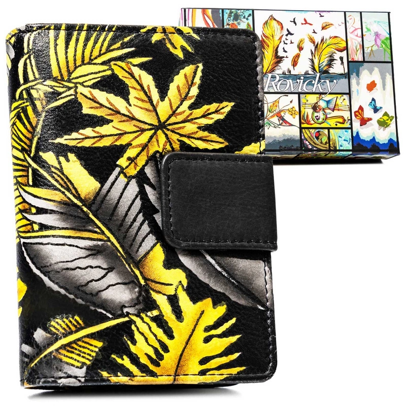 Portfel Rovicky to elegancki i praktyczny dodatek wykonany z wysokiej jakości skóry naturalnej. Pionowa orientacja oraz subtelny roślinny wzór nadają mu wyjątkowego charakteru, a widoczne logo producenta podkreśla markowy styl. Model zapinany jest na solidny zatrzask, co gwarantuje bezpieczeństwo przechowywania zawartości.