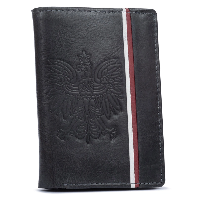 - Portfel wykonany ze skóry naturalnej nubukowej. Wytłoczony orzeł i biało-czerwona flaga froncie portfela nadają mu elegancki, patriotyczny wygląd. Model o orientacji pionowej. Wkładka RFID umieszczona w portfelu chroni karty przed odczytem danych.