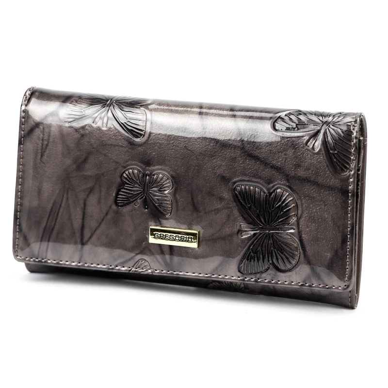 Damski portfel Gregorio to elegancki i funkcjonalny dodatek wykonany z lakierowanej skóry. Posiada klasyczny podłużny fason z poziomą orientacją oraz wzór motyli. Wyposażony w trzy komory, sześć przegródek na karty, dwie kieszenie oraz zasuwaną kieszeń na monety. Zapięcie na zatrzask oraz ochrona RFID zapewniają bezpieczeństwo przechowywanych rzeczy. Widoczne logo producenta oraz oryginalne pudełko sprawiają, że portfel jest idealny na prezent.