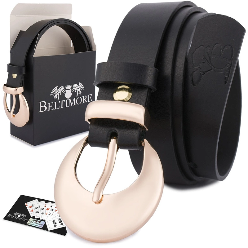 Nietuzinkowy, skórzany, damski pasek do spodni w czarnym kolorze marki Beltimore®.