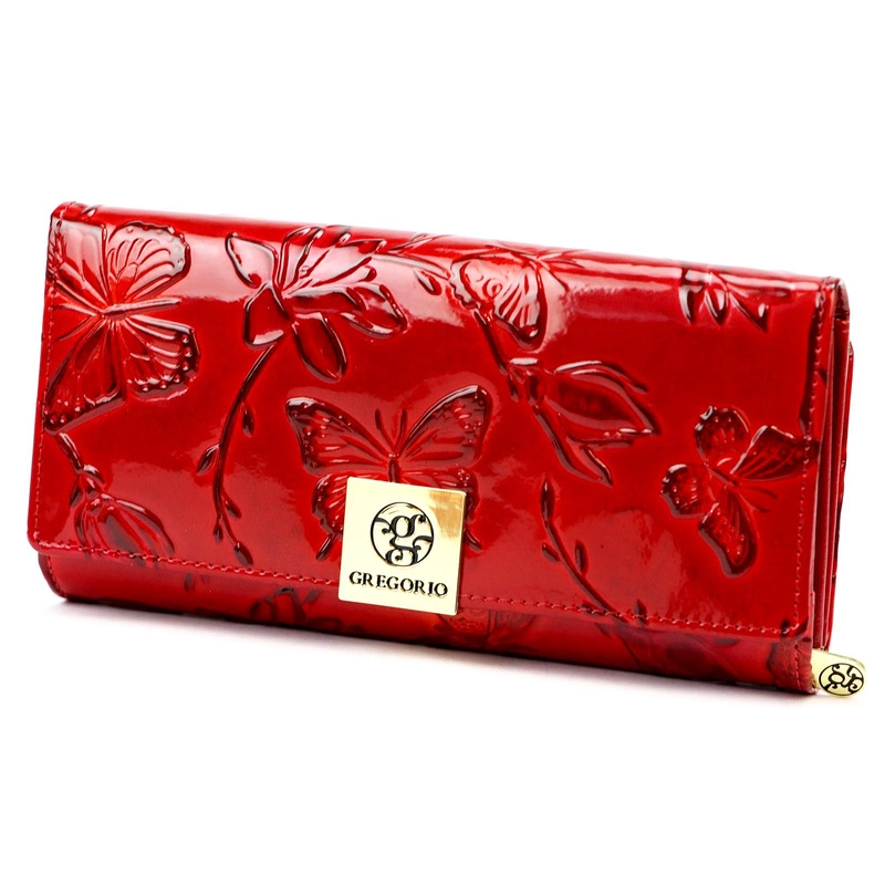 Portfel Gregorio to idealny wybór dla nowoczesnych kobiet, które cenią sobie elegancję i praktyczność. Wykonany z połączenia skóry ekologicznej i naturalnej, portfel oferuje zarówno stylowy wygląd, jak i trwałość. Jego klasyczna, pozioma orientacja oraz unikalny wzór motyli dodają mu wyjątkowego charakteru, a lakierowana skóra podkreśla jego luksusowy wygląd. Srebrne okucia doskonale współgrają z całością, dodając subtelnej elegancji.