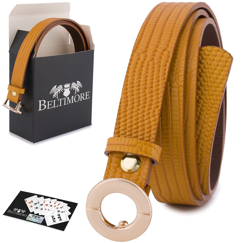 Elegancki, skórzany, damski pasek do spodni w żółtym kolorze marki Beltimore®.
