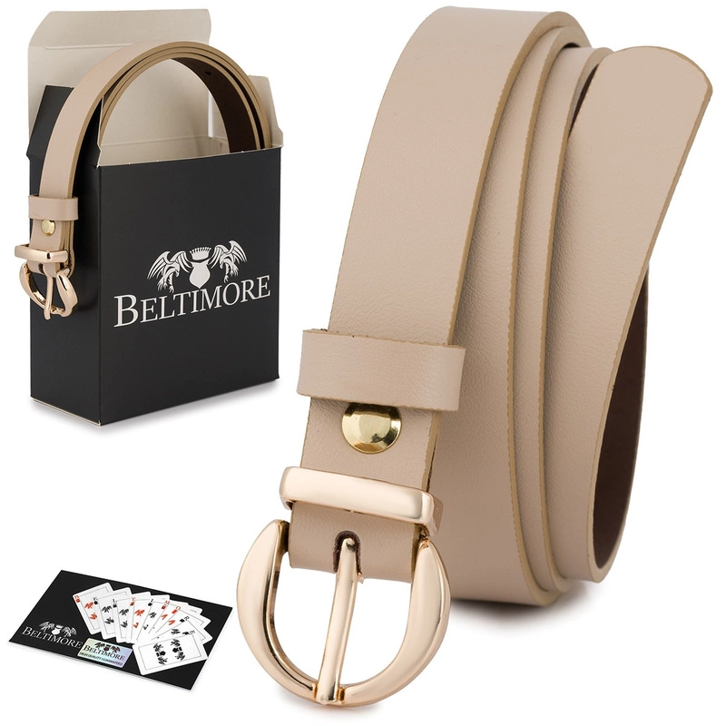 Elegancki, skórzany, damski pasek do spodni w beżowym kolorze marki Beltimore®.
