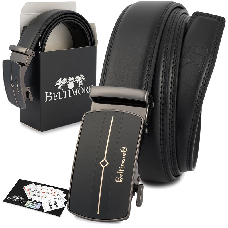 Elegancki, czarny, skórzany pasek męski marki Beltimore®. Wykonany z najwyższej jakości materiałów, z dbałością o szczegóły. Pasek dedykowany jest do spodni casualowych lub do garnituru. Każdy pasek ma szerokość 3,5 cm, pasować będzie zatem do wszystkich spodni.
