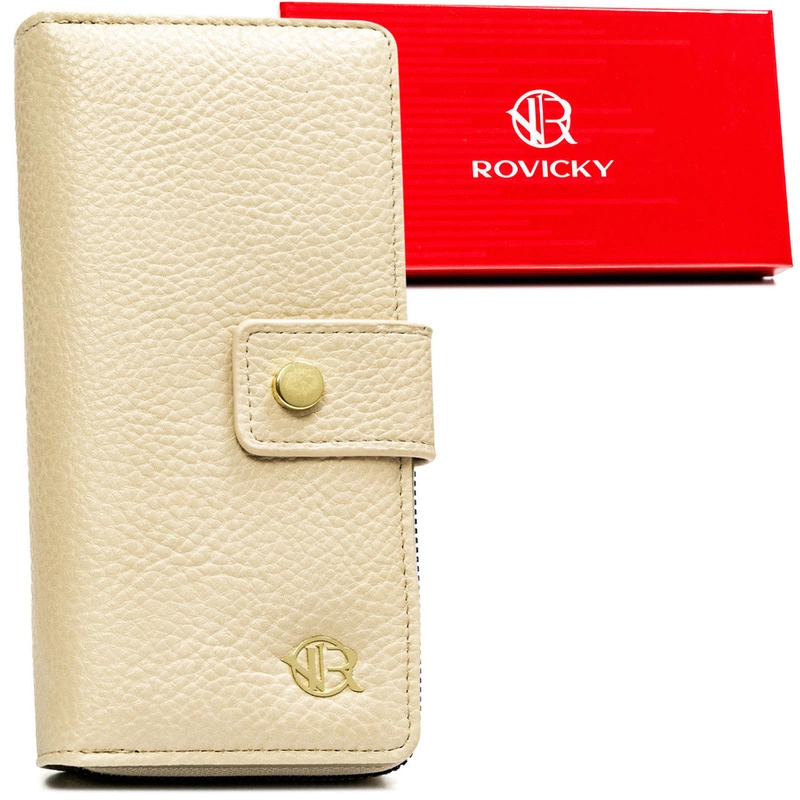 Portfel marki Rovicky to doskonały wybór dla kobiet, które preferują klasyczne rozwiązania z nowoczesnym akcentem. Wykonany z wysokiej jakości skóry ekologicznej w dużym, pionowym formacie, łączy w sobie funkcjonalność i elegancję. Złote okucia subtelnie kontrastują z gładką fakturą materiału, a widoczne logo producenta dodaje całości prestiżowego charakteru.