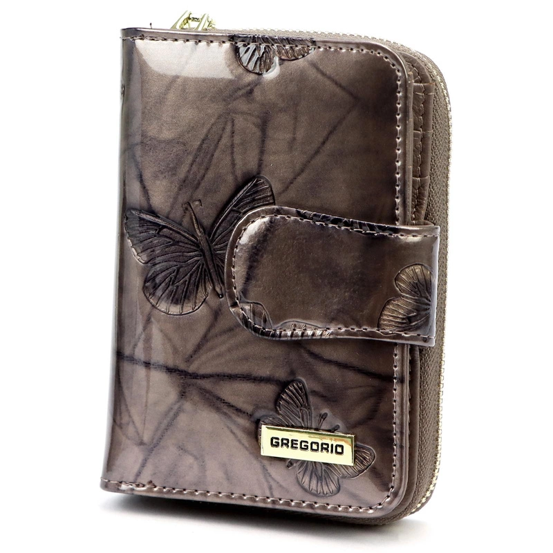 Portfel damski marki Gregorio to doskonały wybór dla kobiet ceniących styl i funkcjonalność. Średniej wielkości, z pionową orientacją, wykonany z najwyższej jakości skóry naturalnej, z subtelnym wzorem motyli. Jego wyjątkowy design podkreślają złote okucia oraz klasyczne zapięcie na zatrzask, które nadają mu elegancji i jednocześnie zapewniają wygodę użytkowania. W widocznym miejscu znajduje się logo producenta, co dodaje prestiżu, a całość zapakowana jest w oryginalne pudełko – idealne na prezent.