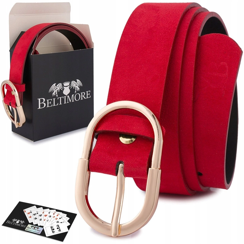 Skórzany pasek damski do spodni sukienki czerwony skóra nat. zamszowa 3 cm Beltimore E51 : Kolory - czerwony, Rozmiar pasków - r.110-125 cm