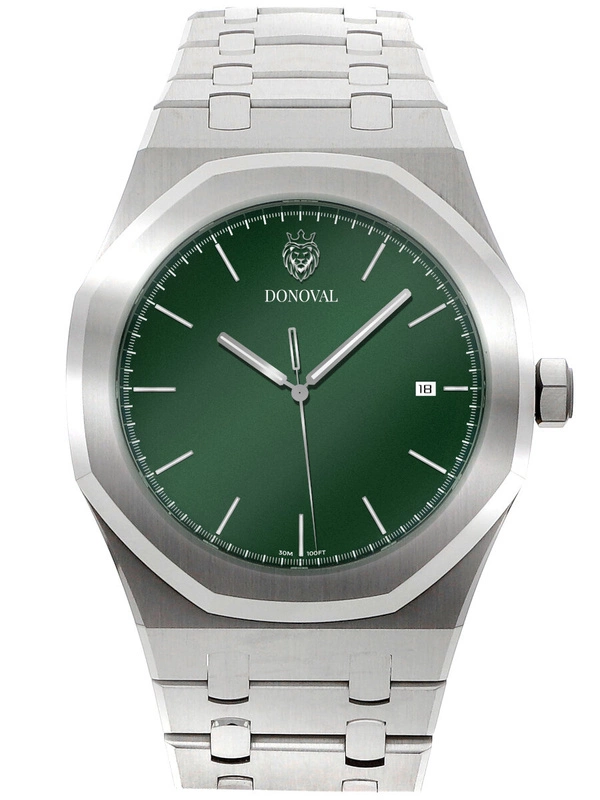 Zegarek na rękę Donoval Otto DL0008 to stylowy męski czasomierz - idealny na co dzień, jak i na specjalne okazje. Koperta wykonana jest ze stali nierdzewnej i ma średnicę 41 mm, również bransoleta wykonana jest ze stali nierdzewnej. Na tarczy w kolorze zielonym zabezpieczonej szkłem mineralnym znajdziemy datownik dnia miesiąca oraz wyznaczniki godzin w kolorze srebrnym. Zegarek napędza kwarcowy mechanizm Miyota.