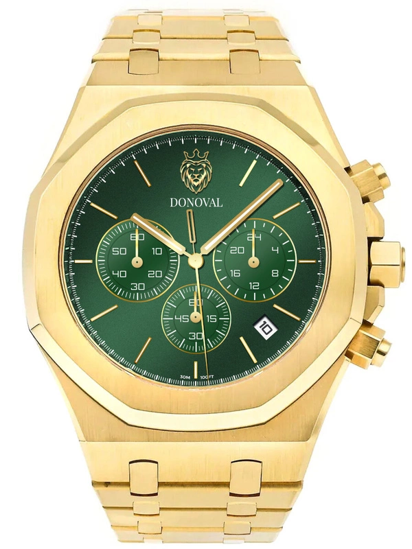 Zegarek na rękę Donoval Otto DL0011 to stylowy męski czasomierz - idealny na co dzień, jak i na specjalne okazje. Koperta wykonana jest ze stali nierdzewnej i ma średnicę 41 mm, również bransoleta wykonana jest ze stali nierdzewnej - całość powleka powłoka w kolorze złotym. Na tarczy w kolorze ciemnozielonym zabezpieczonej szkłem mineralnym znajdziemy datownik dnia miesiąca, subtarcze będące wskazaniami chronografu oraz wyznaczniki godzin w kolorze złotym. Zegarek napędza kwarcowy mechanizm Miyota.