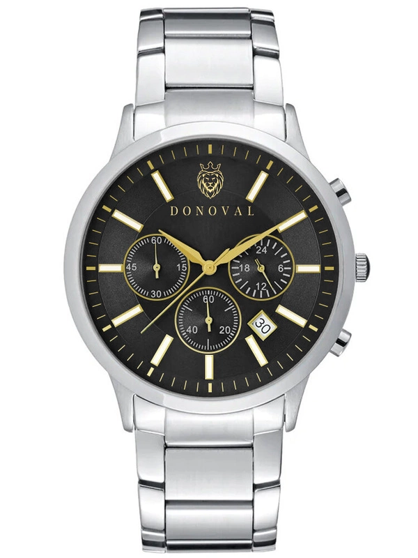 Zegarek na rękę Donoval Chronostar DL0025 to elegancki, klasyczny męski czasomierz - idealny na co dzień, jak i na specjalne okazje. Koperta oraz bransoletę wykonano ze stali nierdzewnej - zapewnia to wieloletnia trwałość. Na tarczy w czarnym granatowym zabezpieczonej szkłem mineralnym znajdziemy datownik dnia miesiąca, subtarcze będące wskazaniami chronografu oraz wyznaczniki godzin w kolorach białym i złotym. Zegarek napędza kwarcowy mechanizm Miyota.