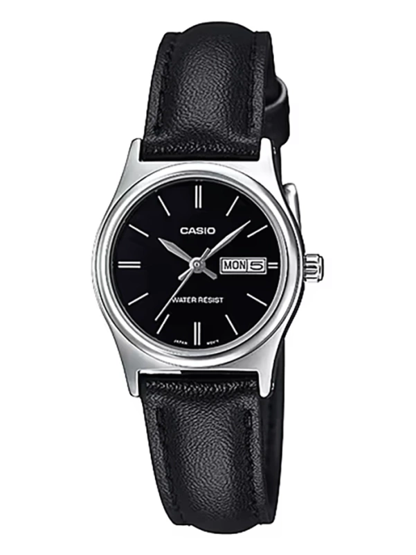 Zegarek damski Casio LTP-V006L-1B2 to elegancki dodatek, który łączy klasyczny design z nowoczesną funkcjonalnością. Jego subtelna, srebrna koperta i delikatny, skórzany pasek tworzą zgrany duet, który z łatwością dopasowuje się do różnych stylizacji – od codziennych, po te bardziej formalne. Czarny cyferblat z prostymi, złotymi wskazówkami i wyraźnymi indeksami zapewnia elegancki wygląd, a jednocześnie sprawia, że zegarek jest bardzo czytelny, nawet w słabszym oświetleniu.