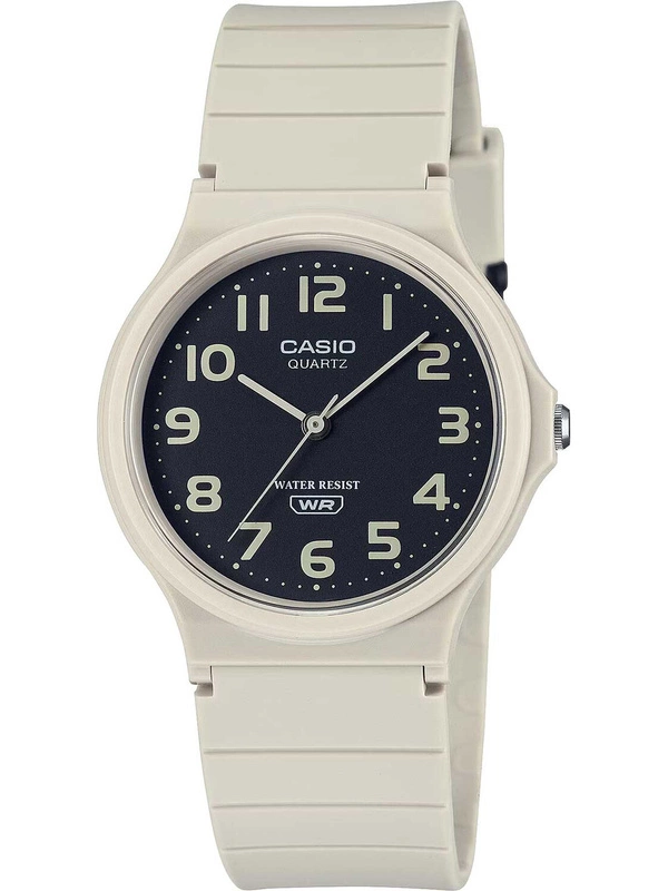 Zegarek damski CASIO MQ-24UC-8BDF to prawdziwe ucieleśnienie prostoty i lekkości. Ten model zachwyca swoją minimalistyczną formą, która doskonale wpisuje się w codzienne stylizacje, dodając im odrobiny sportowego wdzięku. Jego okrągła, wytrzymała koperta z tworzywa sztucznego w beżowym odcieniu prezentuje się niezwykle oryginalnie, a jednocześnie pozostaje uniwersalna, pasując do różnych stylów – od casualowych po bardziej sportowe. Tarcza zegarka, utrzymana w czarnej kolorystyce, została ozdobiona delikatnymi, indeksami w szarym kolorze oraz smukłymi wskazówkami, które zapewniają doskonałą czytelność czasu. Brak zbędnych ozdób sprawia, że zegarek wygląda nie tylko stylowo, ale także niezwykle świeżo i nowocześnie.