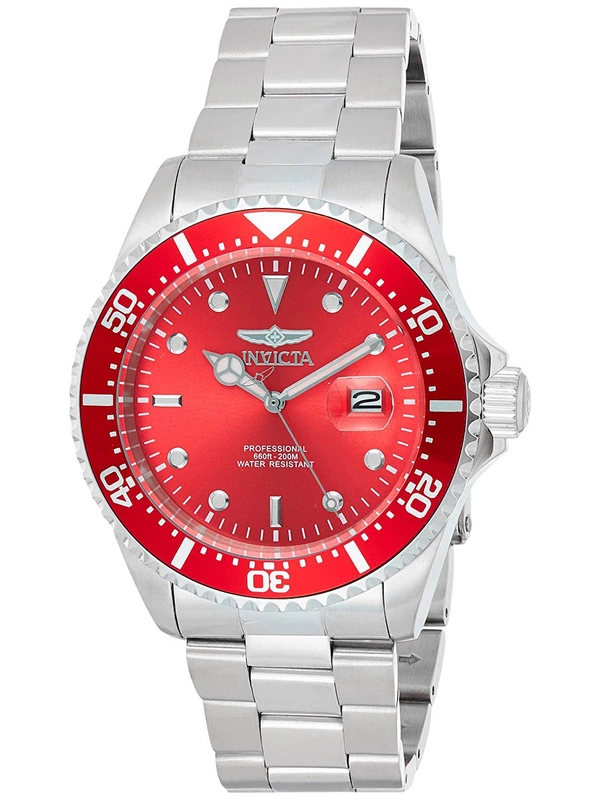 Zegarek INVICTA Pro Diver 22048 to klasyczny nurek z wodoszczelnością do 200m, z kwarcowym mechanizmem SEIKO PC32A. Na czerwonej tarczy znajduje się datownik wskazujący dni miesiąca z lupą oraz fluorescencyjne wskazówki.