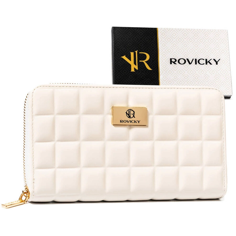 Portfel damski Rovicky to wyrafinowane akcesorium zaprojektowane z myślą o kobietach, które cenią sobie elegancję i funkcjonalność. Wykonany z trwałej, pikowanej skóry ekologicznej w poziomej orientacji, zachwyca dużym rozmiarem i ponadczasowym wyglądem. Złote okucia i widoczne logo producenta podkreślają jego ekskluzywny charakter, czyniąc go idealnym dodatkiem na każdą okazję.