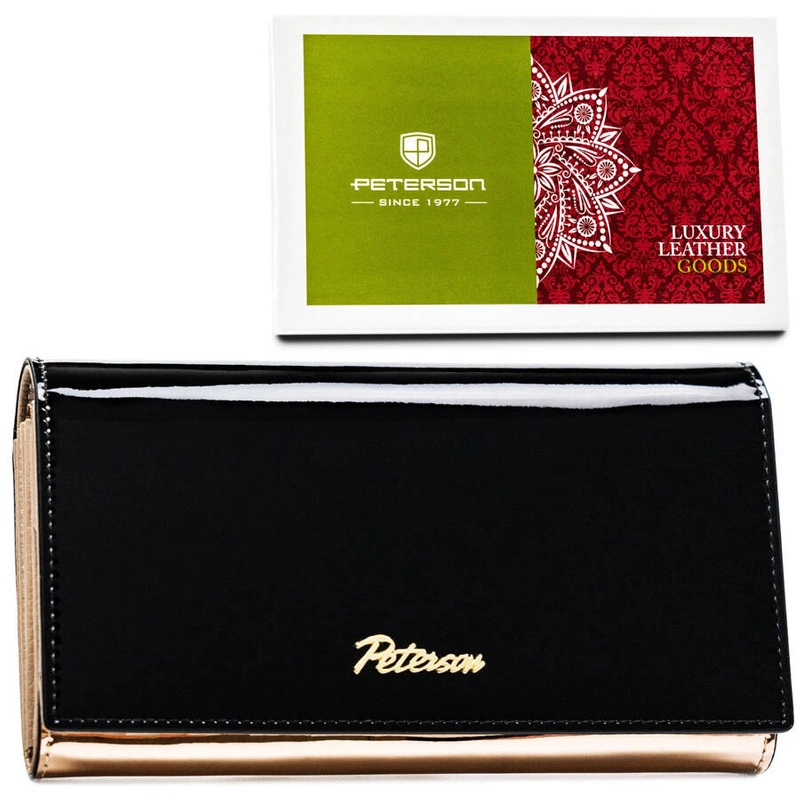 Duży, poziomy portfel damski w kolorze czarno-złotym zamykany na zatrzask - Peterson