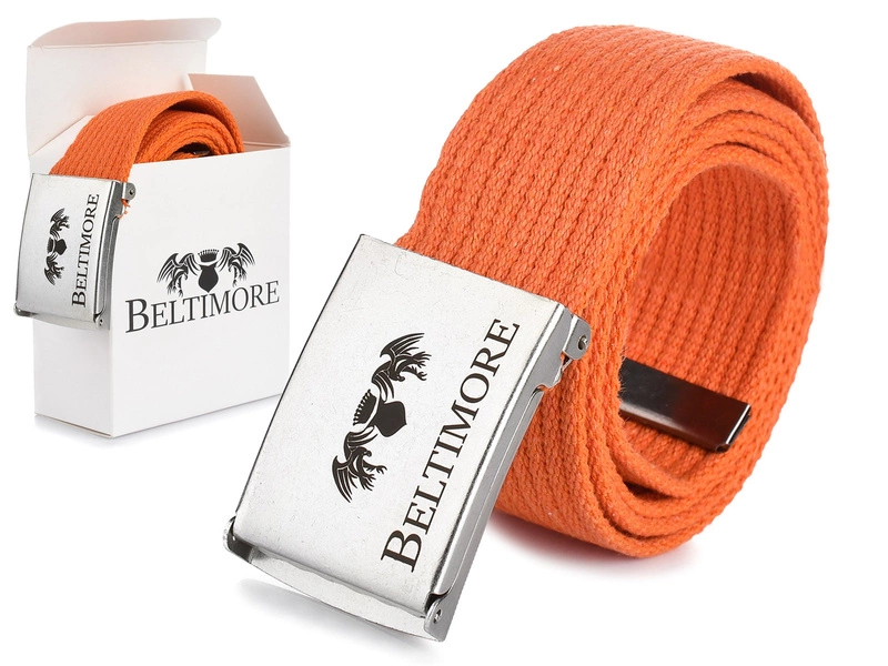 Męski, uniwersalny, parciany pasek marki Beltimore z możliwością regulacji długości w eleganckim, pomarańczowym kolorze.