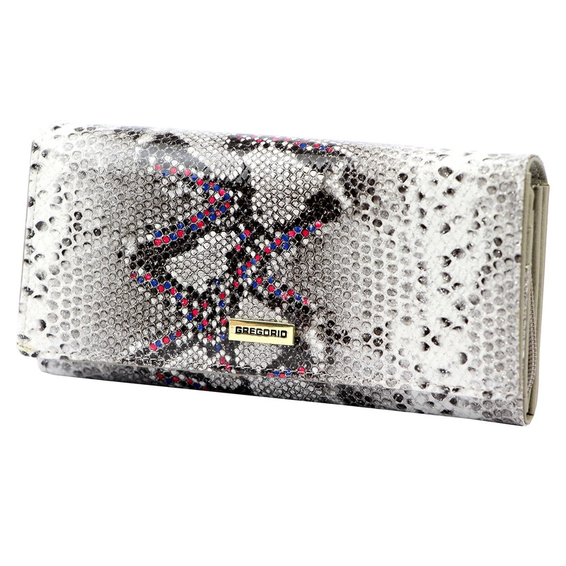 Damski portfel marki Gregorio to elegancki dodatek, który wyróżnia się swoim nowoczesnym designem. Wykonany z naturalnej skóry o wzorze skóry węża, idealnie wpasowuje się w trendy, dodając charakteru każdej stylizacji. Złote okucia oraz subtelnie widoczne logo producenta podkreślają luksusowy charakter portfela. Pozioma orientacja oraz klasyczny, podłużny fason czynią go niezwykle praktycznym i eleganckim.