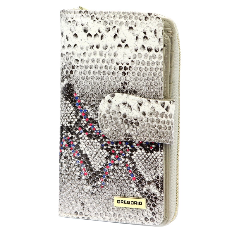 Portfel damski marki Gregorio to połączenie stylu i funkcjonalności, idealne dla kobiet, które cenią sobie luksusowy wygląd i wygodę. Wykonany z naturalnej skóry o fakturze skóry węża, portfel wyróżnia się eleganckim, a zarazem nowoczesnym designem. Złote okucia oraz widoczne logo producenta dodają mu klasy i wyrazistości.
