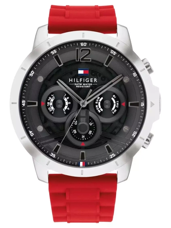 Zegarek męski Tommy Hilfiger LUCA 1710490 to modowy model w stylu casual, który pasuje do wielu stylizacji. Koperta w kolorze srebrnym wykonana z mocnej stali szlachetnej jest odporna na korozję, szkło mineralne na tarczy jest bardzo odporne na stłuczenia i zarysowania, oraz bransoleta w kolorze czerwonym wykonana z silikonu. Tarcza została wyposażona w funkcjonalne tarcze czasu 24h, datownika dni tygodnia oraz datownika dni miesiąca. Wodoszczelność zegarka jest na poziomie 5 ATM, można z nim się bezpiecznie kąpać.