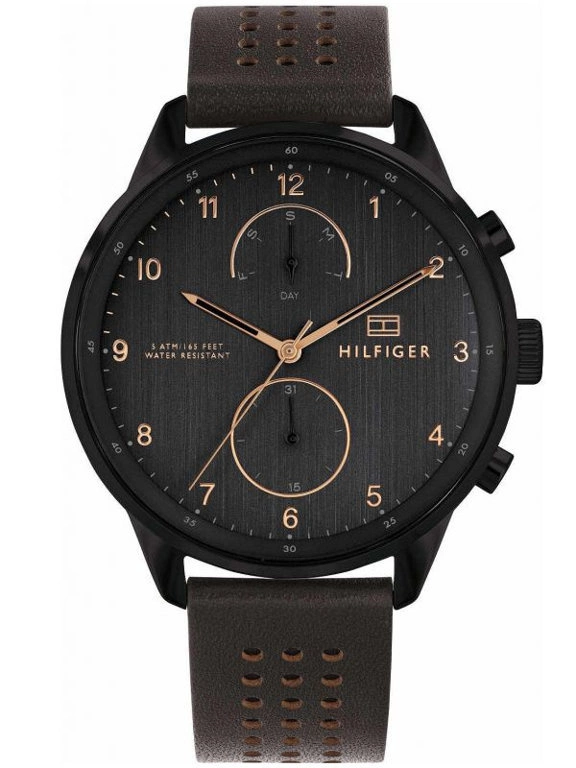 Tommy Hilfiger Chase 1791577 to męski zegarek typu casual.Koperta wykonana z wysokiej jakości stali szlachetnej w kolorze czarnym. Szkiełko mineralne. Dobrej jakości, wygodny pasek, ze skóry naturalnej, w kolorze brązowym. Sercem zegarka jest mechanizm kwarcowy zasilany baterią. Wodoszczelność w klasie 50 metrów oznacza, że zegarek jest chroniony przed kontaktem z wodą lub zachlapaniem. Datownik rozbudowany wskazuje nie tylko numer dnia miesiąca ale także nazwę dnia tygodnia.
