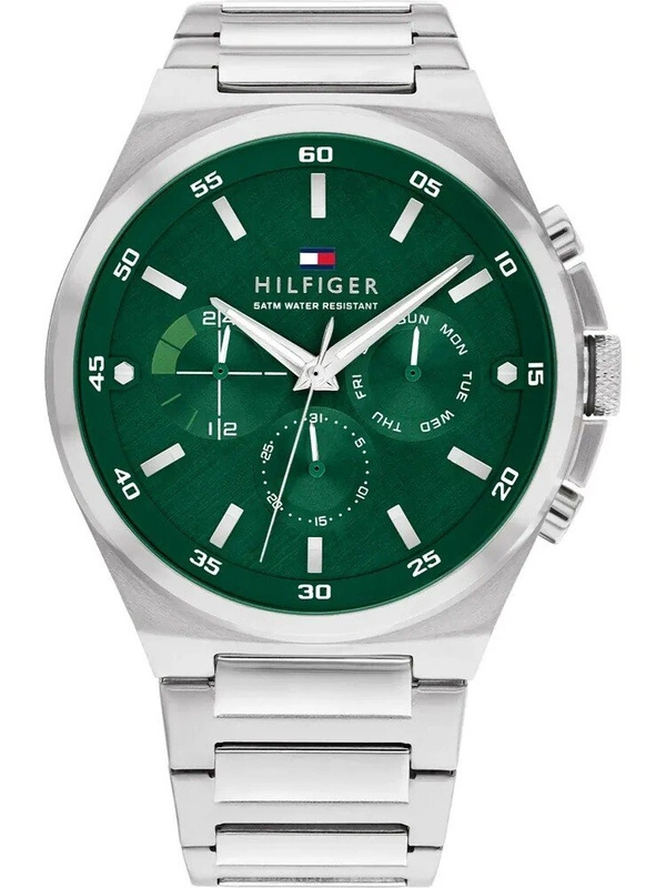 Zegarek męski TOMMY HILFIGER DEXTER 1792088 to nowoczesny i elegancki model do noszenia na co dzień. Koperta oraz bransoleta wykonana wysokiej klasy stali szlachetnej 316L, odpornej na korozję oraz hipoalergicznej w kolorze srebrnym. Na oryginalnej zielonej tarczy, ze szlifem słonecznym znajdują się subtarcze wskazujące: dzień miesiąca, dzień tygodnia oraz czas 24 godzinny. Całość chroniona szkłem mineralnym. Za odmierzanie czasu w zegarku Tommy Hilfiger WILD 1792070 odpowiada mechanizm kwarcowy, do którego energia go zasilająca pochodzi z baterii. Model DEXTER 1792088 posiada wodoszczelność na poziomie 5ATM co czyni go w niewielkim stopniu odpornym za wodę. Całość dopracowano w najdrobniejszym szczególe oraz zaprojektowano w zgodzie z aktualnymi trendami w modzie, otrzymując klasyczny, ale jakże elegancki zegarek.