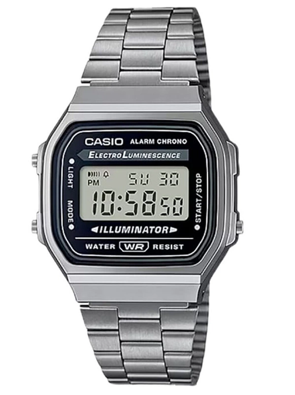 Casio A168WGG-1A przyciąga wzrok swoim kultowym, retro designem. Srebrna, metalowa koperta o prostokątnym kształcie oraz charakterystyczny, metalowy pasek typu mesh nadają mu industrialnego, a zarazem eleganckiego wyglądu. Czarna tarcza z cyfrowym wyświetlaczem LCD tworzy harmonijną całość z resztą zegarka, która przywołuje klimat lat 80. To zegarek, który nie tylko pokazuje czas, ale także opowiada historię.